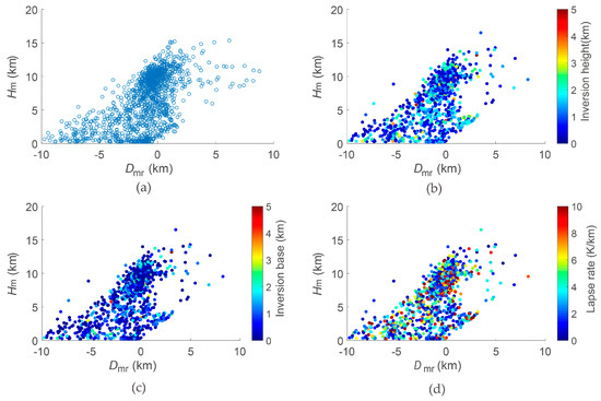 Relevance of temperature inversion in the Dmr. The Dmr values from collocations without temperature inversion are shown in (a). In the presence of temperature inversion, (b) shows the relationship between Dmr and temperature inversion height, (c) is the relationship between Dmr and the temperature inversion base, and (d) illustrates the relationship between Dmr and a negative temperature lapse rate.