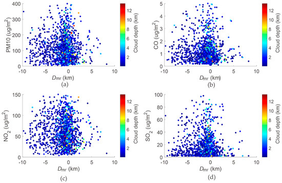 Relevance of PM10 (a), CO (b), NO2 (c) and SO2 (d) in Dmr. The color bar in each panel indicates the cloud depth.