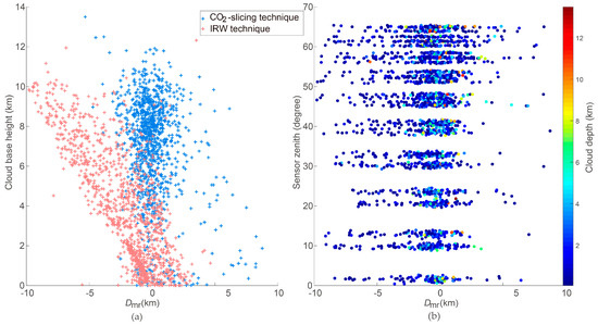 Figure 10a presents all Dmr values retrieved from the IRW technique and CO2-slicing technique with individual colors. It is found that the CO2-slicing technique performs much better than the IRW technique for mid- and high-level clouds (CBH >2 km), while IRW technique is better for low-level cloud (CBH ≤2 km). Most large differences are produced by the IRW technique. Table 4 presents the statistical results of the two retrieval methods. The mean Dmr for the CO2-slicing technique is 0.09 km, whereas it is −2.20 km for the IRW technique. The CO2-slicing technique shows a weak tendency of overestimation for clouds when the CBH is less than 2 km. In Section 4.1.2, it is found that MODIS tends to underestimate high thin cloud but overestimate low thin clouds, which is also shown in Figure 10a. When the CBH is less than 1 km, the IRW technique tends to overestimate the CTH (0.04 ± 1.29 km). However, when the CBH is above 4 km, most CTHs are underestimated by the IRW technique (−4.14 ± 2.60 km). Overall, the IRW technique produces more large uncertainties.