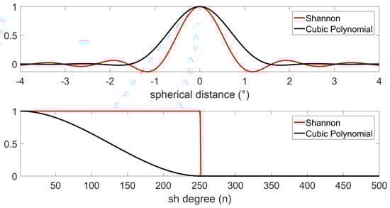 Different types of SRBFs can be found among others in [,]; the frequently used types include the Shannon function, the Blackman function, the cubic polynomial (CuP) function, and the Poisson function. Two types of band-limited SRBFs are used in this work, one without smoothing features (Shannon function), i.e., their shape coefficients (Legendre coefficients) equal to 1 for all frequencies within a certain bandwidth, and the other one with smoothing features (CuP function).