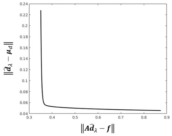 wherein can be interpreted as the regularization parameter, see [,]. When is set to the zero vector, Equation (20) reduces to the Tikhonov regularization, and the regularization parameter can be determined by the L-curve method.