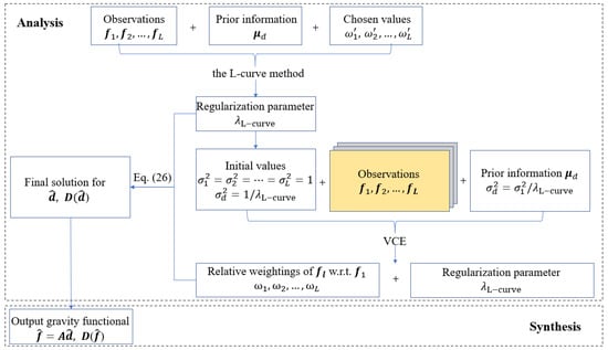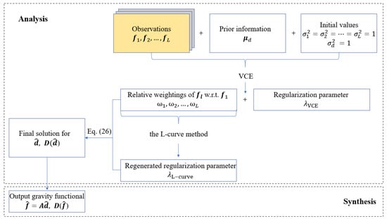 Figure 4 illustrates the procedure of the Lc-VCE. In contrast to the VCE-Lc, in the Lc-VCE the L-curve method is applied first based on chosen values for the relative weights in Equation (24). A regularization parameter is obtained in the first step, and it is used for defining the value of in the variance component estimation.