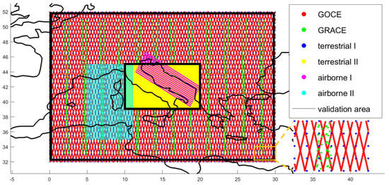Figure 5 illustrates the available observation data as well as the validation data. The two validation areas are presented with black rectangles: the larger area (Synthesis Data I) has a spatial resolution of and is simulated with a maximum degree of 250; the smaller area (Synthesis Data II) has a spatial resolution of and with a maximum degree of 2190. Four types of observations are included: