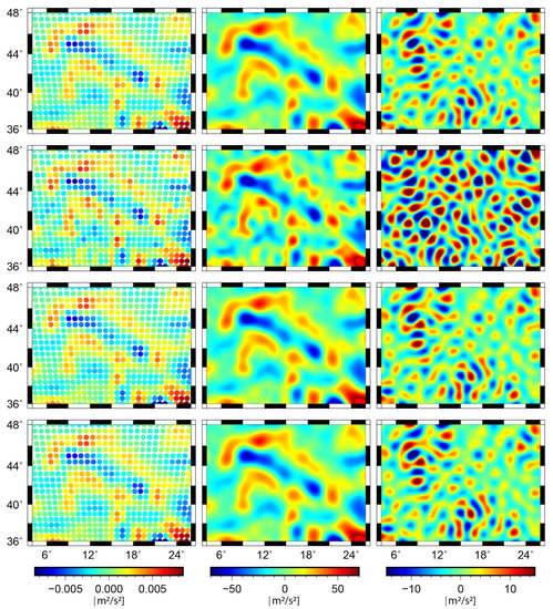 For each type of gravitational functional, the adapted basis functions are derived by the zeroth, first, or second order derivatives of Equation (1), and they are listed in Table 1. Basis functions adapted to other functionals of the disturbing potential which are not used here can be found in [,,].