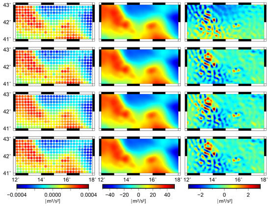 In this study, different observation types are combined in a “one-level” manner, which is also applied in, e.g., [,,]. The relative weights indicate the contributions of different observation types []. Another way for combining different types of observations is the spectral combination (see, e.g., in [,,]), where the (spectral) weights depend on the spectral degree. The spectral weights at each degree can be incorporated into the (kernel) functions [], and studies about how to find the optimal kernels can be found in, e.g., [,]. However, details about the spectral combination technique would go beyond the scope of this study.
