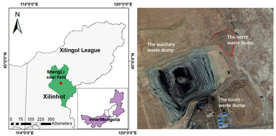 The study area in this research is ‘The North Waste Dump’. It is a typical dump site located in the ShengLi coal field, northern suburb of Xilinhot, Inner Mongolia, China. The ShengLi coal field is a NE-SW strip-shaped distribution with an average length of 45 km, and width of 7.6 km. Opencast mining is the primary method used in the coal field, and 15.93 Gt of reserves have been explored. The North Waste Dump is located in the west No. 1 open-pit mine in the coal field, and is surrounded by the South Waste Dump and the Auxiliary Dump (Figure 1).