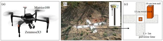 Study equipment and materials. (a) Matrice100 and ZenmuseX3 camera, (b) ground control points (GCPs) were measured by Trimble R8 global navigation satellite system (GNSS), (c) detailed description of GCPs.