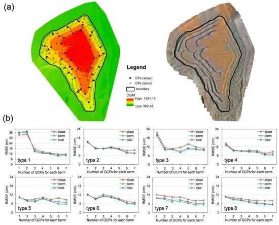 Accuracy variations for different configuration types. (a) the DSM and the orthomosaic, (b) the root mean square errors (RMSEs) obtained for each type.