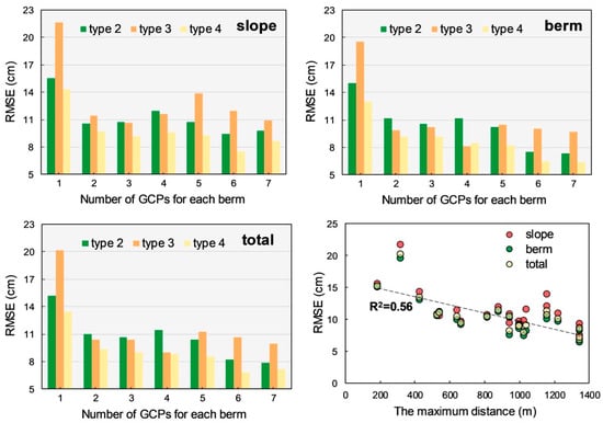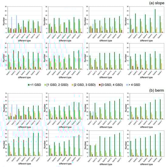 These observations were verified and were more pronounced on the berm (Figure 5b). As the number of berms increased, the high-valued RMSE (>3 GSD) decreased, except for type 8-1. Furthermore, we found that the proportion of CPs greater than 3 GSD for each type was slightly lower than that of the slope, which is also consistent with the line results (Figure 4b).