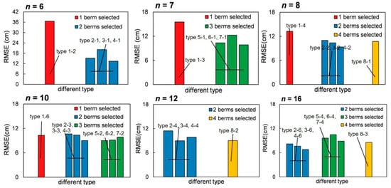 The RMSE decreased with the number of berms (which indicates more GCPs; Figure 4). Furthermore, the same number of GCPs showed a deviation in the RMSE when laid on different numbers of berms (Figure 6). A worse accuracy occurred when the GCPs were laid on one berm (type 1). For n = 6, the RMSE of type 1-2 was 36.61 cm, which is much greater than type 2-1 at 15.16 cm, type 3-1 at 20.16 cm, and type 4-1 at 13.42 cm. For n = 7, the RMSE of type 1-3 was 15.54 cm, which is greater than those of type 5-1 at 10.34 cm, type 6-1 at 12.26 cm, and type 7-1 at 9.86 cm. However, deviations in the RMSE decreased as the number of GCPs increased. For n = 8, the RMSE of type 1-4 was still the highest, but the deviation reduced to 2.28–3.9 cm. This deviation was reduced to 0.21–0.32 cm for n = 10. When the number of berms increased from two (types 2, 3, and 4) to three (types 5, 6, and 7) or four (type 8), the RMSE did not significantly decrease, and a higher accuracy was achieved by setting the GCPs on two berms. The GCP configurations on three berms, in the case of n = 8, had a worse accuracy than on two berms (type 4-3) with a RMSE of 9.02 cm. For n = 16, all GCP configurations on two berms (types 2-6, 3-6, and 4-6) had a lower RMSE than three berms. Similarly, this occurred when the GCPs were laid on four berms. For n = 8, the RMSE of types 3-2 and 4-2 were 10.39 and 9.36 cm, respectively, but type 8-1 was 10.75 cm. For n = 12, the RMSE of type 3-4 was 8.99 cm, which was lower than type 8-2 at 9.04 cm. For n = 16, the RMSE of type 8-3 was 8.55 cm, which was higher than types 2-6 at 8.1 cm and 4-6 at 6.79 cm. From our results, considering the resources and efficiency (red arrow in Figure 3 was our track in the field investigation), the same number of GCPs on two berms was the most suitable way to control the accuracy compared to other types.