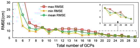 The variation of total RMSE value with the total number of GCPs was shown in Figure 7. For a better visualization, the RMSEs over 30 cm are not shown. It should be pointed out that different types had different values in the case of the same number of GCPs (Figure 4), so three different RMSE standards, including maximum, minimum and mean values, were calculated. The results showed that the total RMSE of 116 CPs showed a decreasing trend with more GCPs. The RMSE decreased sharply from 36 cm to around 13 cm when the number of GCPs increased from 5 to 9 in the study area. Then, this decline became more gradual, with an RMSE of 9—13 cm as the number of GCPs increased to 19. Furthermore, the RMSE further reduced to less than 1GSD (< 6 cm) when the number of GCPs was increased to 32.