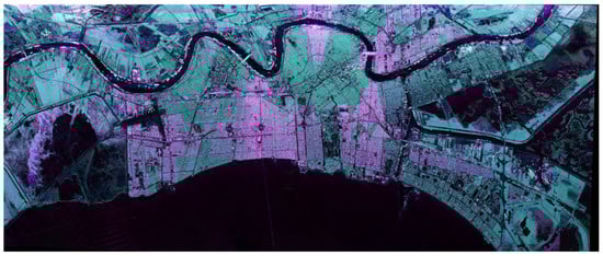 PolSAR image acquired by UAVSAR in the Pauli basis (double-bounce in red, single scattering in blue, cross-polarization in green) over New Orleans, Louisiana, U.S.