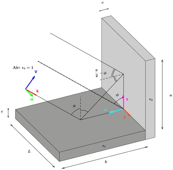 We propose to consider Figure 3 to set up the configuration of our problem. The dihedral structure is here made of two parts, with the same width c: the horizontal one is a homogeneous block of relative permittivity ; the vertical one is a homogeneous block of relative permittivity ; and are complex numbers. This dihedral structure is illuminated with a plane wave, impinging with an incidence angle ϕ. The plane of symmetry of the dihedral contains the wave vector k. The orientation angle ψ is the rotation angle around z-axis. In this configuration, there is no orientation angle: ψ = 0. When a dielectric dihedral is well aligned with the radar line of sight, its response is maximum. In this case, we have shown that the double-bounce scattering mechanism can be approximated using two successive specular reflections over the two parts of the dihedral [11], as illustrated in Figure 3. When there is a specular mechanism, a particular incidence angle ϕ exists—known as Brewster’s angle (BA) or Pseudo Brewster’s Angle (PBA)—for which the VV reflected field is either null or minimum whether the dielectric material has losses or not. When this dielectric is lossless, its permittivity ε is real, and can be analytically derived using the Snell–Descartes law. We obtain the well-known relation: