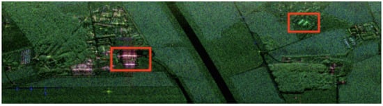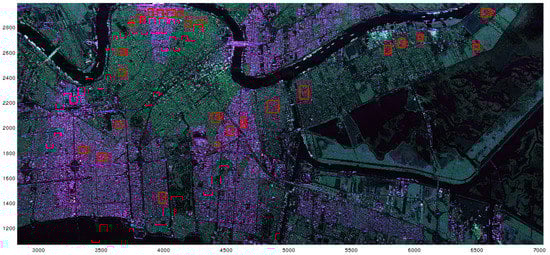 PolSAR image of New Orleans acquired by UAVSAR (L-band) in the Pauli basis. The sensor trajectory is parallel to the top of the figure. Red rectangles refer to selected areas.