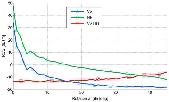 Variation of the backscattering coefficients at VV (blue) and HH (green) for an orientation angle ψ ranging from 0 to 45 degrees. In red, the result of .