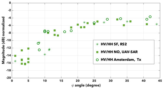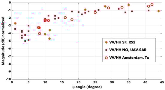 To plot the angular variation of the DBE, we note the co-pol ratio defined as , where denotes the backscattering coefficient at polarisation XX. If the DBE occurs, then . In Figure 9, we plot the ratios that we collected for all the red rectangles. We can immediately notice that this quantity is always inferior to 0 dB. Two domains can be then empirically defined, before and after around 20°. Before 20°, we can observe a significant difference between VV and HH, ranging from −5 dB to −1.5 dB with a noticeable dispersion. For Bretigny, for the two sheds well aligned with the sensor trajectory, we obtain −8.5 dB and −12 dB. After 20°, the variation of is clearly smaller and almost all data are contained in dB for the remaining angles. Surprisingly, we notice no difference associated with the radar characteristics or to the specificity of the cities, as if we reached a limit value for this DBE. If we consider additional results issued from Bretigny or the financial district of San Francisco, we have equal respectively to 0 dB and +0.4 dB at maximum. Regarding the accuracy of the sensor, we could confidently assess that even for other buildings than residential ones, this observation is still true.