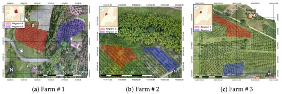 Individual tree detection (ITD) locates plants from images to estimate agronomic parameters (like spatial distribution, crown sizes, and vegetation fraction), promoting the management of forestry and agriculture systems []. In fruit plantations, the monitoring parameters allow assessing tree density growth, orchard biomass changes, and fruit yield production []. At vast plantations, remote sensing technologies facilitate the extraction of ITD-based parameters, employing satellite images that may be acquired by a wide variety of sensors at several spectral and spatial resolutions [,]. Nonetheless, related to ITD systems, the use of satellite data suffers from a long repetition cycle and coarse resolutions, limiting its usage in those applications that involve small areas or time-sensitive decisions []. So, both (spatial and temporal) resolutions could be improved using private satellites, but they are more expensive [].
