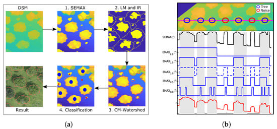 Framework of the proposed Cumulative Summation of Extended Maxima transform (SEMAX) methodology for automatic tree detection. (a) Pipeline of processing stages; (b) 1-D representation of compared morphological transforms.
