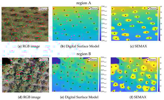 For illustration, Figure 3 draws the processing stages performed by SEMAX through the evolution of DSM representation for regions A and B, having different types of trees. Both input RGB images in the left column exemplify a tree distribution, which in the concrete case is manually labeled and denoted by the red dots. The middle column pictures the color maps to explain the differences in the terrain level estimated by DSM, while the right column depicts the resulting SEMAX data. In the case of region A (top row), all treetops are disseminated evenly, and the DSM representation reveals that the separation between ground and canopies is not constant. Thus, the affecting height variations are adjusted to the same level by the proposed operator in Equation (4). However, the landscape of region B holds differences in height with such an uneven tree distribution that causes subtle variations in elevation between the overlapped tree canopies. Consequently, the SEMAX* approach wrongly identifies several cumulus of trees as a single one. Therefore, additional restrictions to the detection task should be incorporated when dealing with overlapped canopies together with uneven sowing patterns.