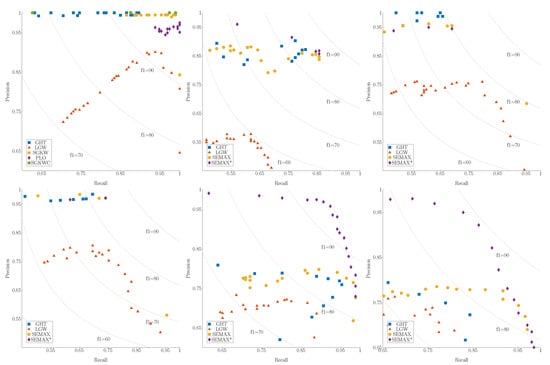 The following aspect of consideration is the parameter influence (namely, the threshold) on the tree detection rate that is depicted in Figure 4. The X-axis denotes the recall value that is the fraction of the total amount of relevant instances (trees) that are actually retrieved, and the Y-axis represents the precision value that is the fraction of relevant instances among the retrieved ones []. Thus, whenever the threshold increases in LGW, PLO, SEMAX, and SEMAX* algorithms, the recall value also rises, meaning that more trees are correctly detected. However, this behavior continues to a certain degree. So, by raising the threshold too high, several noisy regions can be wrongly identified as trees, as more clearly perceived for regions E and F in Figure 3. Note that this situation holds for all algorithms except the case of GHT that should be more related to canopy shape detection rather than treetop identification. Lastly, LGW performs about less true positive rate, on average across regions, due to the treetop heights are highly variable, hindering the tree identification by a single threshold value.