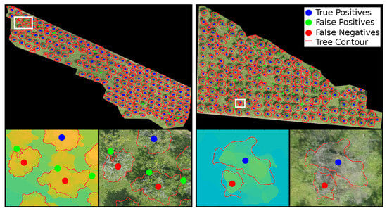 As a rule, tree labeling is not usually performed on the DSM representation due to the presence of noisy regions that may resemble some plantation shapes. Instead, labeling is performed on the RGB representation that allows identifying directly from the original picture, whether one region can be labeled as a single tree. As stated in [,], this situation makes many studies use manually delineated tree crowns as reference data. However, such data could include subjective errors [].