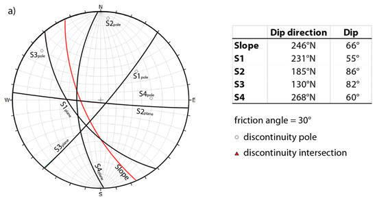 Moreover, four intersections between fractures could be considered critical for the wedge sliding (F1-F2a/b, F1-F3, F1-F4 and F3-F4) (Figure 10c).
