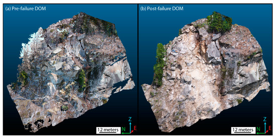 Point clouds representing the unstable portion of the rock slope (a) before (April 17th 2018) and (b) after (May 30th 2018) the landslide.