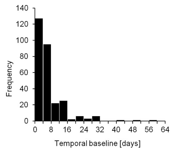 The data stack provided very high temporal resolution across the whole observation interval, owing to a nominal site revisit of 16 days with each satellite. In particular, the dataset of Wuhan allowed a revisit time of 10 (average), 8 (median) and 4 (mode) days, since the full constellation of four COSMO-SkyMed satellites was exploited. The histogram of the temporal baselines is shown in Figure 2. Accounting that other X-band SAR missions at equal StripMap spatial resolution (e.g., TerraSAR-X) provide 11-day revisit time at best, and the C-band Sentinel-1 constellation up to 6 days, but with much coarser resolution (i.e., 5 m × 20 m, single look), the revisit time achieved with the COSMO-SkyMed data stack is the best currently available over Wuhan, and ideal to analyze traffic patterns.