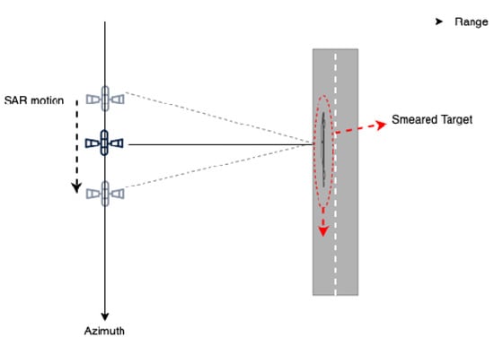 A target moving along the same path as the radar sensor (i.e., along-track) appears smeared in the SAR image, as schematically shown in Figure 4. The smearing effect depends on the size of the integration angle, which is the angle through which the radar sensor moves relative to the pixel, as the backscatter values of the pixel are coherently summed during the SAR image formation. If the integration angle is small, the smearing effect is linear, while if the angle is big, the effect is more like a curve.
