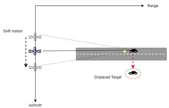 In SAR, the specific way in which a moving target gets displaced or defocused in the image depends on how the target moves relative to the radar sensor []. Along-track motion (i.e., when the target moves parallel to the satellite path) smears the target, while cross-track motion (i.e., when the direction of target motion is orthogonal to the satellite path) shifts the target image in the azimuth direction, while generally preserving its focused appearance. The characteristics distinctive of ground-based moving objects in SAR images are normally described by three features: (i) target displacement in azimuth direction; (ii) azimuth target blurring in the image because of the velocity in the azimuth and the range acceleration; and (iii) residual Doppler centroid, that is the averaged Doppler frequency of static ground points and it is usually needed for SAR focusing.