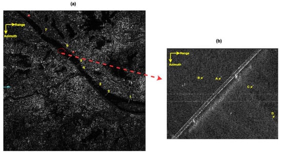 As discussed in Section 2.3.2, the azimuth shift of the moving target () can be used to calculate the velocity of the vehicle along the range direction, i.e., . The latter is part of the total velocity vector of each vehicle, and it is related to it via trigonometry, namely as: , where β is the angle between the bridge direction and the ground range (e.g., in the example shown in Figure 8)