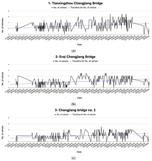 It is worth considering that, in general, the motion speed of vehicles could also be used to indirectly estimate the total number of vehicles crossing the bridges. Indeed, in the case of traffic jams, vehicles generally move slowly, while in the absence of traffic vehicles usually move at the allowed speed limit. However, heavy vehicles crossing the bridges in Wuhan can show very different velocities even in low traffic situations. The main reason for this is that for most of these bridges, the vehicles need to climb up to the generally much more elevated height of these huge bridges. Heavy vehicles climbing up will slow down significantly, and their speed reduction greatly depends on the carried load. Therefore, very heavy vehicles generally move far below the speed limit over such bridges, as they are only slowly climbing or slowly accelerating after the climb. Similarly, these heavy vehicles avoid high speeds while going down. For this reason, the use of a simple relationship between vehicle speed and number of vehicles would not be suitable in this and similar contexts, and therefore the numbers of vehicles detected are based on the image analysis and vehicle counting as described above.