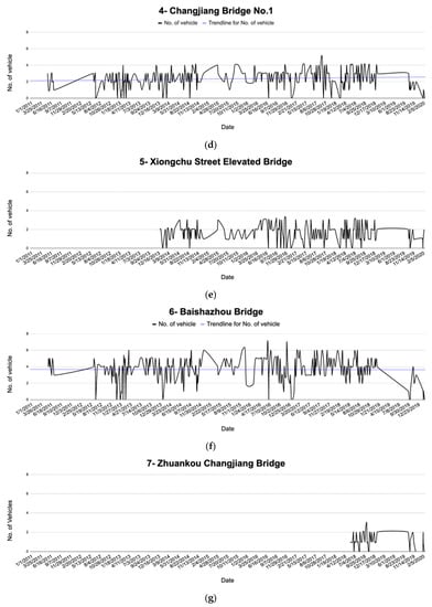 The average number of detected vehicles was low on Tianxingzhou Changjiang Bridge in 2011, as it increased from an average of two vehicles to almost four vehicles at the end of 2019, while a linear average of four vehicles was found on the Baishazhou Bridge. Compared to this general trend over the last few years, a sudden decline can be seen after January 2020 in coincidence with the city of Wuhan being set to quarantine (Figure 10). The traffic has been reduced significantly on all bridges, where the number of detected vehicles generally dropped to around 1 or 2, as can be seen in the seven plots in Figure 10. Linear fits in each graph were obtained for all the available images of each bridge, from 2011 to 2020. In this regard, it can be noted that the trend on bridges 1, 2, 3, and 4 shows a small rise in the number of detected vehicles, while the average trend remains stable on bridge 6.
