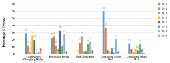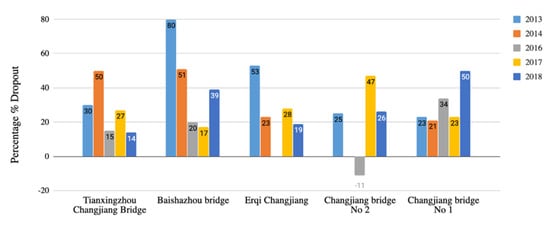 Figure 12 shows traffic reduction on major holidays, with some of the missing numbers in the graph indicating missing values in 2011, 2012 and 2015, when we do not have any satellite images covering the holiday periods. Normally, traffic congestion is low on holidays, as seen in the figure. Nevertheless, Baishazhou Bridge has an unusual high dropout of 80% in 2013, which could be a result of traffic restrictions. However, no external information is available to validate this hypothesis. Moreover, we see a negative dropout rate at Changjiang Bridge No. 2 in 2016, which indicates traffic increase instead of dropout, as shown by the negative number.
