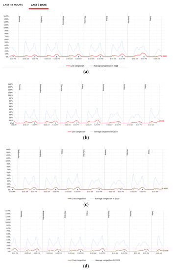 TomTom traffic congestion index during the COVID-19 lockdown of Wuhan: (a) 10/02/2020–16/02/2020, (b) 19/02/2020–25/02/2020, (c) 25/02/2020–02/03/2020, and (d) 02/03/2020–09/03/2020.