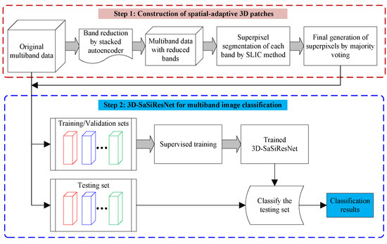 In this section, we provide the detailed procedure of the proposed method, which contains two main parts: construction of 3D spatial-adaptive patches and 3D-SaSiResNet for multiband image classification (see Figure 1). Both parts of the proposed method are important for multiband image classification. First, compared to fixing the training or testing samples at the center of the patches, constructing spatial-adaptive patches can fully follow the spatial characteristics of the multiband image, making the pixels within the same patch more likely to be in the same category. It is notable that the hyperspectral image usually has more than one hundred contiguous bands, and band reduction is also essential to reduce the computational cost in the first steps. Second, the 3D-SaSiResNet facilitates the extraction of discriminant features and classification of multiband images.