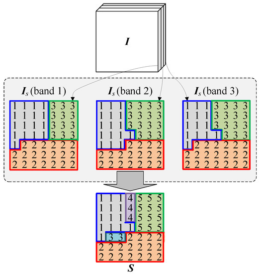Simple linear iterative clustering (SLIC) [20] is then performed on each of the reduced bands to obtain over-segmented maps. Letting be the multiband image with reduced bands and be the superpixel segmentation results obtained by performing SLIC to each of the b band, the final superpixel map can be generated by Algorithm 1. Moreover, Figure 3 gives an example about how to obtain . There are three bands in , and denotes the segmentation results of SLIC. In case the intersection of all the over-segmented regions where the pixel located is not empty, the pixels located at that intersection will be given the same label. Otherwise, a single label is given to the th pixel. The above-mentioned procedure is repeated with changes from to , and the superpixel map is finally generated by traversing all of the pixels in . Moreover, it is important to note that the labels in denote different segmentation blocks rather than represent the class labels of land covers.