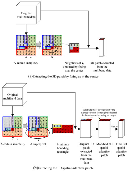 Given the superpixel map , instead of fixing a certain sample at the center, the 3D spatial-adaptive patch of is determined by cropping the minimum bounding rectangle of the superpixel in which lies and extracting the pixels from the input multiband image according to the cropped minimum bounding rectangle. To ensure all the pixels in the same patch have the same land-cover class, those pixels, which are located in the minimum bounding rectangle but do not belong to the same superpixel, are substituted by the mean of the rest pixels in the minimum bounding rectangle. All of the 3D patches are resized to the same window size by bicubic interpolation for the convenience of model training. Specifically, Figure 4 depicts a schematic example of the patch generation procedure. The window size of the patch is set to . Figure 4a denotes the procedure of extracting a 3D patch by fixing a certain sample at the center, the materials, and land-covers of the neighbors may be quite different from , and the number of patches is equal to the number of samples. Figure 4b denotes the procedure of extracting a 3D spatial-adaptive patch, in which the neighbors are more likely to have the same labels as . Moreover, all the pixels that are contained within the same superpixel result in the same 3D spatial-adaptive patch, and, therefore, the number of generated 3D spatial-adaptive patches is equal to the number of superpixels. Taking each 3D spatial-adaptive patch as an object in multiband classification, the 3D-SaSiResNet is, in essence, an object-based method rather than a pixel-based method.
