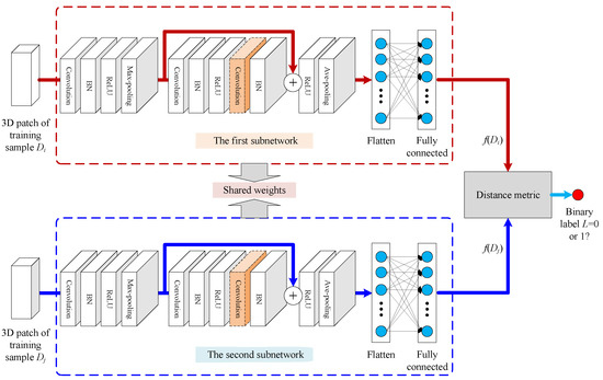 After the architecture of the 3D-SaSiResNet is constructed, we train the model for many epochs using the pairs . The parameter of the 3D-SaSiResNet is updated through minimizing the contrastive loss function