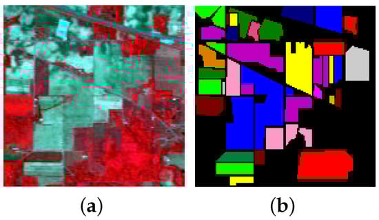 - Indian Pines data: the first dataset was gathered by the National Aeronautics and Space Administration’s (NASA) Airborne Visible/Infrared Imaging Spectrometer (AVIRIS) sensor in 1992 over an agricultural area of the Indian Pines test site in northwestern Indiana. The selected scene consists of 145 × 145 pixels and 220 spectral reflectance bands cover the wavelength range of 400 to 2500 nm. After removing 20 bands (i.e., bands 104–108, 150–163 and 220) corrupted by the atmospheric water-vapor absorption effect, 200 bands are considered for experiments. The spatial resolution of this dataset is about 20 m per pixel. The three-band false color composite image together with its corresponding ground truth is depicted in Figure 6. Sixteen different classes of land-covers are considered in the ground truth, which contains 10,366 labeled pixels ranging unbalanced from 20 to 2468, posing a big challenge to the classification problem. The number of training, validation, and testing samples in each class is shown in Table 1, whose background color corresponds to different classes of land-covers. Moreover, note that the total number of samples in class 9 (i.e., Oats) are only 20, and we set the number of validation samples to 5 in this class.