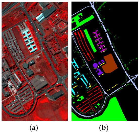 Figure 7. University of Pavia data. (a) three-band false color composite, (b) ground truth data with nine classes.