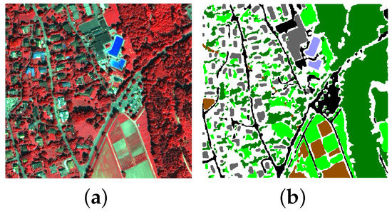 - Zurich data: The third dataset was captured by the QuickBird satellite in August 2002 over the city of Zurich, in Switzerland [55]. There are 20 images in the whole dataset and we choose the 18th image for experiments. The chosen image consists of four spectral bands spanning near-infrared to visible spectrum (NIR-R-G-B) and the size of each band is 748 × 800 with a spatial resolution of 0.61 m per pixel. The color composite image and the ground truth are plotted in Figure 8. Six classes of interest are contained in this dataset and the detailed number of training, validation and testing samples in each class is displayed in Table 3, whose background color represents different classes of land-covers.