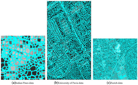 Final superpixel segmentation results of the three experimental datasets. (a) Indian Pines data, (b) University of Pavia data, and (c) Zurich data.