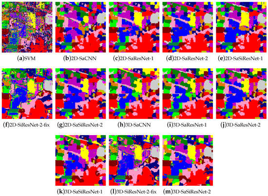 Classification maps of the Indian Pines data obtained by (a) SVM, (b) 2D-SaCNN, (c) 2D-SaResNet-1, (d) 2D-SaResNet-2, (e) 2D-SaSiResNet-1, (f) 2D-SiResNet-fix, (g) 2D-SaSiResNet-2, (h) 3D-SaCNN, (i) 3D-SaResNet-1, (j) 3D-SaResNet-2, (k) 3D-SaSiResNet-1, (l) 3D-SiResNet-2-fix and (m) 3D-SaSiResNet-2.