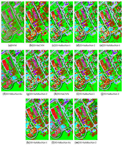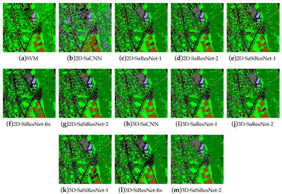 Classification maps of the University of Pavia data obtained by (a) SVM, (b) 2D-SaCNN, (c) 2D-SaResNet-1, (d) 2D-SaResNet-2, (e) 2D-SaSiResNet-1, (f) 2D-SiResNet-fix, (g) 2D-SaSiResNet-2, (h) 3D-SaCNN, (i) 3D-SaResNet-1, (j) 3D-SaResNet-2, (k) 3D-SaSiResNet-1, (l) 3D-SiResNet-2-fix and (m) 3D-SaSiResNet-2.