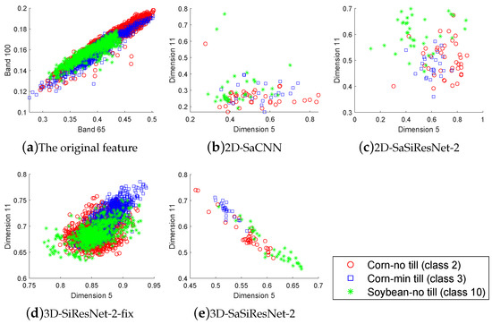 Scattering map of the two-dimensional features obtained by (a) the original data, (b) 2D-SaCNN, (c) 2D-SaSiResNet-2, (d) 3D-SiResNet-2-fix, and (e) 3D-SaSiResNet-2 for the Indian Pines data. (a,d) represent the features of each pixel while (b,c,e) are the features of each patch; therefore, the number of features in object-based methods (i.e., (b,c,e)) are much less than that in the original data (i.e., (a)) and the pixel-based method (i.e., (d)).