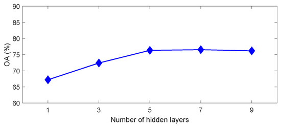 As shown in Figure 14, we set the number of hidden layers in SAE as 1 (the number of the unit is set to 5), 3 (the number of units is set to 100, 25 and 5, respectively), 5 (the number of units is set to 100, 50, 25, 10 and 5, respectively), 7 (the number of units is set to 150, 100, 75, 50, 25, 10, and 5, respectively), and 9 (the number of units is set to 175, 150, 125, 100, 75, 50, 25, 10, and 5, respectively), and the classification accuracy varies with the different number of hidden layers. It can be observed that the OA is relatively low when the number of hidden layers is 1 or 3. When the number of hidden layers is equal to or larger than 5, the classification performance is satisfactory. In this paper, we set the number of hidden layers to 5 since more hidden layers will increase the complexity of the model.
