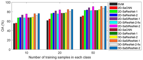 Figure 15 depicts the OA of different methods with various numbers of training samples for the Indian Pines data. The number of training samples in classes 1, 7, and 9 is constantly set to 10 in different cases. It can be seen from Figure 15 that the classification performance of all considered methods yields stable improvement with the increase of the training set size. For instance, the OA of 2D-SaCNN is lower than 60% in case 10 training samples per class are selected and is increased to more than 70% with 50 training samples per class. This stresses again the importance of training samples for multiband images classification. Moreover, it can be concluded from Figure 15 that the 3D-SaSiResNet has better classification performance than the Siamese convolutional neural network (S-CNN) proposed in [45]. This is because, when the number of training samples in each class equals 50, the classification accuracy of S-CNN is lower than 90% (see Figure 20 in [45]), while the accuracy of our proposed method is higher than 90% with 16 rather than nine classes of land-covers and using 50 training samples per class.