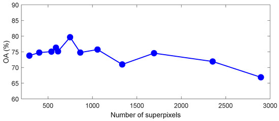 Figure 16 plots the OA against the number of superpixels for the Indian Pines data. The number of superpixels is varied within the range from 290 to 2896. We can observe that a dramatically upward tendency appeared with an initial increase of superpixel number, and the classification accuracy decreases in case the number of superpixels is over a certain value (e.g., 1057). Based on the above analysis, too small and too large number of superpixels may be harmful to the classification performance, and it is better to utilize suitable superpixel numbers according to the object characteristics’ spatial structure of the remote sensing data.