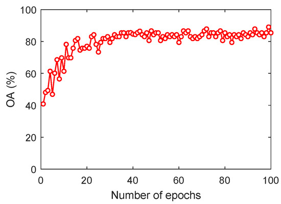 Furthermore, the impact of the number of training epochs is depicted in Figure 17. It can be seen that the OA rapidly increases in the first couple of epochs and then improves slowly as the number of epochs increases. Finally, the OA trends to a certain stable value with the increased number of epochs. As shown in Figure 17, it is suggested that the 3D-SaSiResNet-2 is trained more than 30 epochs to obtain stable and effective classification performance.